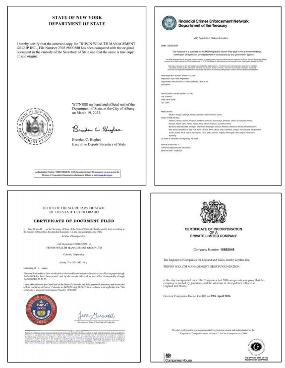 TRIPON was founded in 2023 and is headquartered in New York, USA. Although it has not been established for a long time, TRIPON has quickly emerged in the global wealth management field with its outstanding professional capabilities and innovative spirit. Since its establishment, the company has obtained a number of international compliance qualifications and licenses, including New York State compliance qualification, US NFA financial license, US MSB financial license, US Colorado compliance qualification, Singapore foundation license and British foundation license.