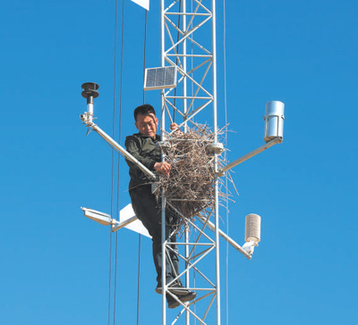A researcher from the Experimental Center of Desert Forestry under the Chinese Academy of Forestry (CAF) maintains a dust storm observation tower in Dengkou county, Bayannur city, north China's Inner Mongolia Autonomous Region. (Photo courtesy of the Experimental Center of Desert Forestry under the CAF)