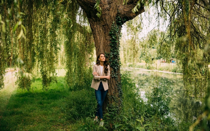 Leaning on a weeping willow on the Windsor estate,the Princess of Wales looks,at first glance,like she has never been away.