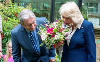 Queen Camilla smells flowers alongside Alan Titchmarsh