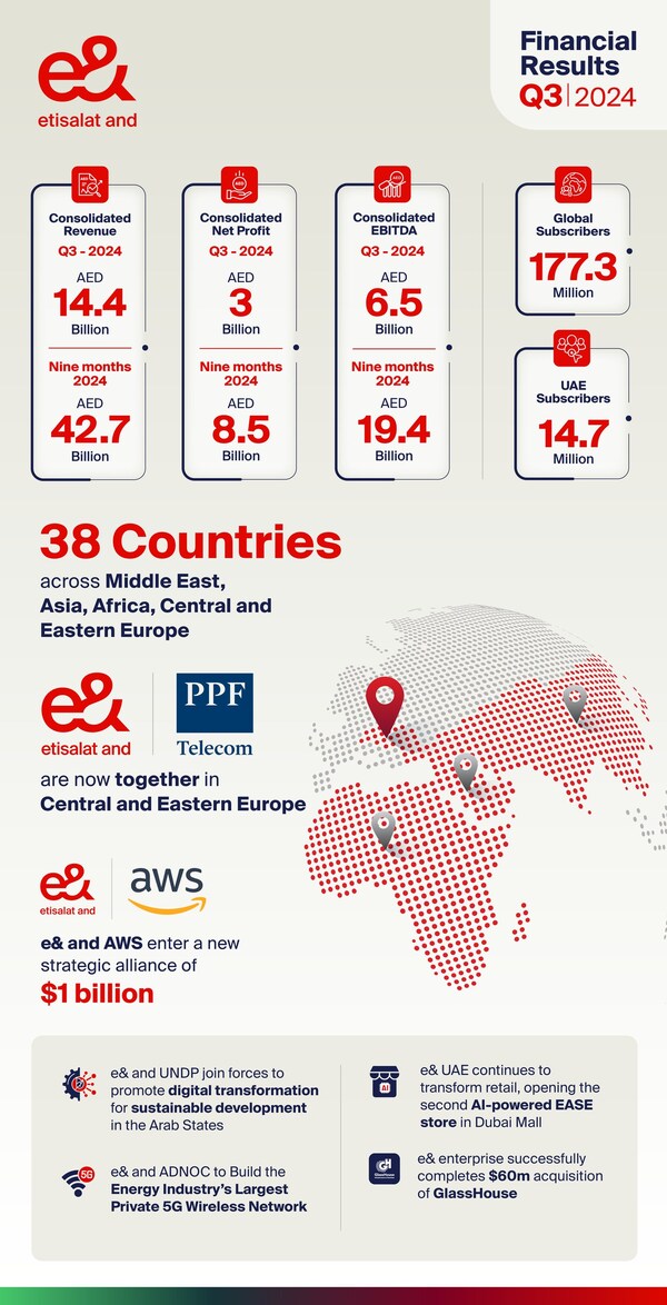 We scaled up e&'s telecom footprint to 20 countries,bringing our overall reach to 38 markets. This growth,coupled with our solid performance in both local and international markets,drove our consolidated net profit to reach AED 8.5 billion growing 10 per cent during the first nine months. Furthermore,consolidated EBITDA reached AED 19.4 billion,resulting in EBITDA margin of 45 per cent,while our telecom EBITDA margin remained resilient at 49%".