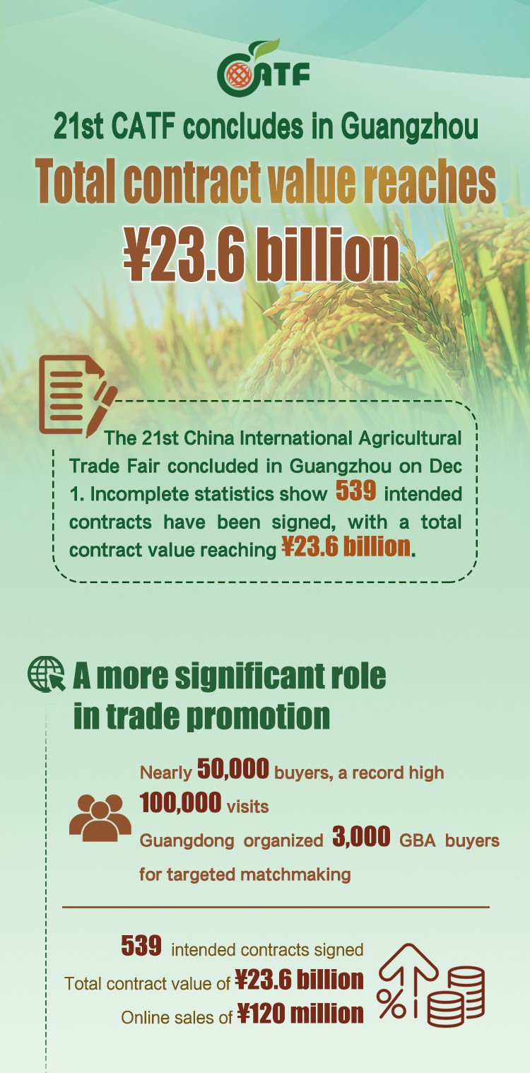 The 21st China International Agricultural Trade Fair (CATF), hosted by the Ministry of Agriculture and Rural Affairs, concluded in Guangzhou on Dec 1. The fair attracted more than 100,000 visits and nearly 50,000 buyers, hitting a record high. Incomplete statistics show that a total of 539 intended contracts were signed at the fair, with a total contract value of 23.6 billion yuan.