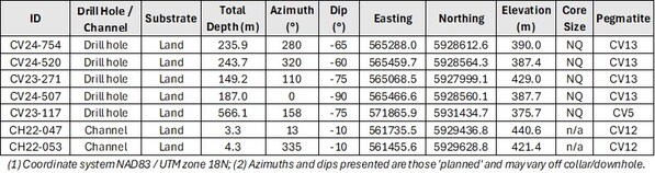 All reported widths are core length. True widths are not calculated for each hole due to the relatively wide drill spacing at this stage of delineation and the typical irregular nature of pegmatite,as well as the varied drill hole orientations. As such,true widths may vary widely from hole to hole.