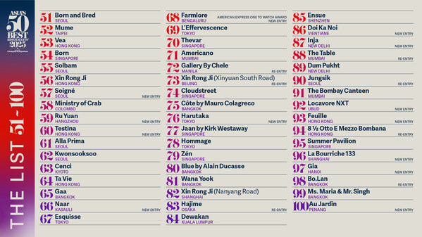 Asia's 50 Best Restaurants,announces the extended 51-100 list for 2025