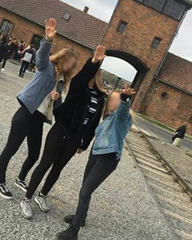 Three girls caused an uproar in 2018 when they made the Nazi salute,which is illegal in Germany,but not in Poland where Auschwitz is located (Picture: CEN)