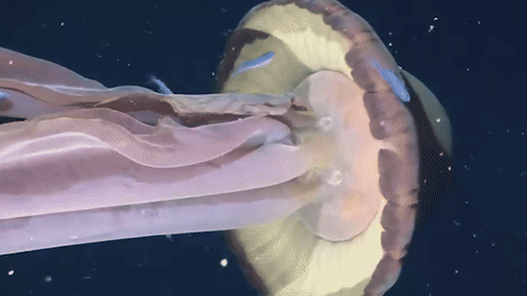 Stygiomedusa gigantea is the scientific name for the giant phantom jellyfishStygiomedusa gigantea is a type of deep-sea jellyfish that has only been seen around 100 times since its discovery in 1899.Scientists did not even recognise this type of jellyfish as a species until 60 years after it was discovered due to the infrequent sightings.This species has been observed and filmed off the Pacific coast of the United States,off the coast of Japan,and in the Gulf of Mexico.Although very little is known about how the jellyfish survives,it is assumed they feed on plankton and small fish.It is not the biggest jellyfish in the ocean,but its bell (the main part of a jelly’s body) can be more than a meter wide.Giant phantom jellyfish have oral arms rather than the stinging tentacles typically associated with jellyfish,which they use to grab onto their prey and guide it towards their mouths.Before underwater robots were invented,experts used trawling nets to study deep-sea creatures like the giant phantom jellyfish.When one is captured and brought to the surface,researchers said its silky-looking frame turns to ‘gelatinous goo’.This means that the use of underwater robots is the best way to observe the species and learn more about them.The Monterey Bay Aquarium Research Institute (MBARI),a separate research organisation,says their ROVs have done a ‘thousand of dives’ but have only seen the giant phantom jellyfish species nine times.